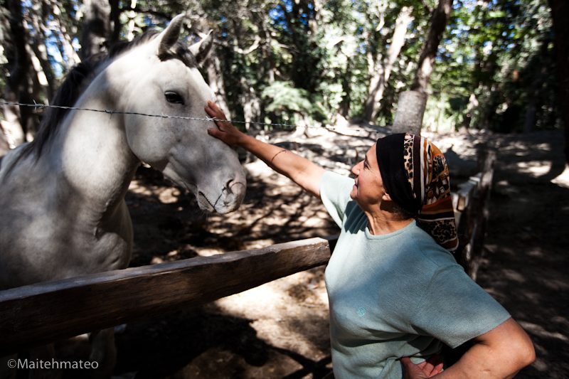 Rosa Soganzo Paichil vive en el cerro Belvedere. Rodeada de arrayanes, el árbol típico de la zona de Villa Langostura, ya en extinción. Sin luz ni agua corriente, me recibe en su cocina, muy pequeña para su gusto, entre cazuelas de olores deliciosos. Camina cojeando mientras prepara mate y me cuenta que se recupera de su segunda operación de cadera y como su esposo se está quedando ciego por la diabetes. La acompaño a dar de comer a los chanchos (cerdos), las gallinas, las ocas y a su bello caballo.