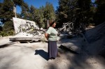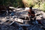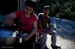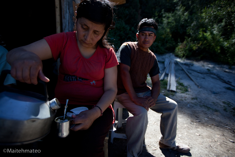 Terminadas las tareas cotidianas, Rosa me propone visitar los territorios donde se produjo el último y mas dramático de los desalojos hace tan sólo unos meses. Subimos por la colina sorteando árboles y ramas, en medio de un silencio roto sólo por el crujir de nuestros pasos. Rosa conoce cada sendero, cada piedra, cada planta y me explica el valor medicinal de cada una. Sandro, su sobrino nos está esperando en otra parte del bosque. Nos acompaña por si hubiera problemas con el americano propietario de las tierras desalojadas. Lo encontramos hurgando entre las cenizas de la que era su casa, hasta que hace unos meses se la quemaron. Salieron a trabajar y a la vuelta encontraron sólo cenizas. Ellos insisten en que nunca hacen fuego por las mañanas sin embargo la policía no encuentra indicios de que fuera intencionado. Pero Sandro no tiene tiempo para rencores. Su casa nueva ya se levanta cerca de las cenizas y en ella, nos invita a mate.