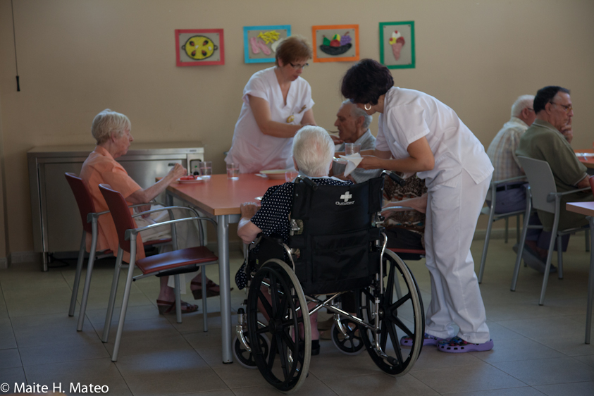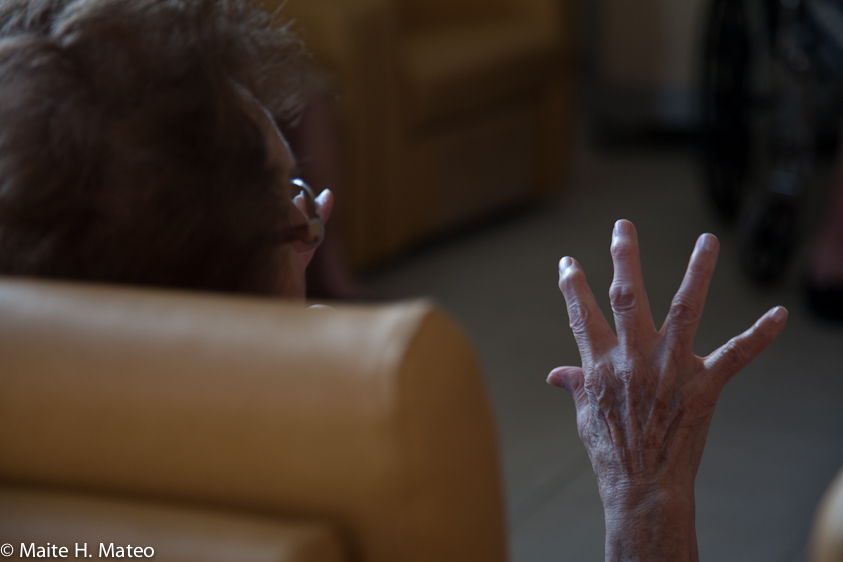 Por los pasillos me encuentro a Beti, es Inglesa e inquieta. Pese a que me dicen que ya ni en Ingles habla yo lo intento. Parece que me entiende, pero de su boca no sale nada coherente. Sin embargo sigo hablándole en Ingles y noto cierta conexión. Beti me sigue sin parar por los pasillos. Yo le sigo hablando. En un momento, se acerca a la mesa donde charlo con algunas de las cuidadoras y me dice.