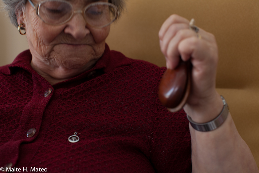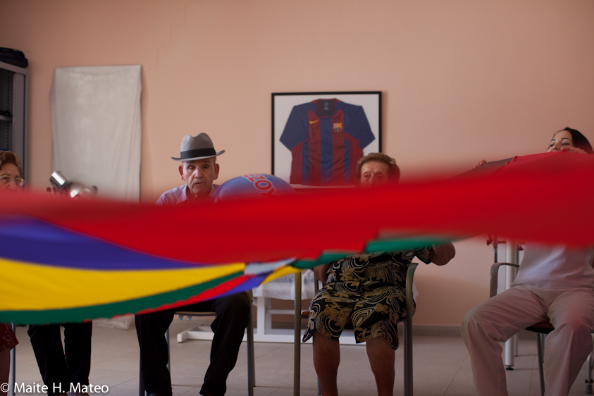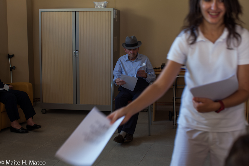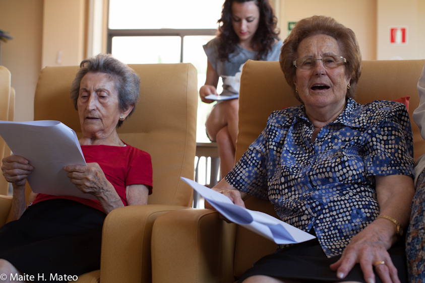 Ya en clase, los mas aventajados, aquellos a los que el Alzheimer no les ha robado la capacidad de interactuar, se preparan para una intensa mañana que comienza con gimnasia. «Arriba y abajo, arriba y abajo…» dice Delia animando con energía. Después vendrán canciones populares dirigidas por la animadora social Sonia y amenizadas por una de las alumnas diplomada en castañuelas y alegría.