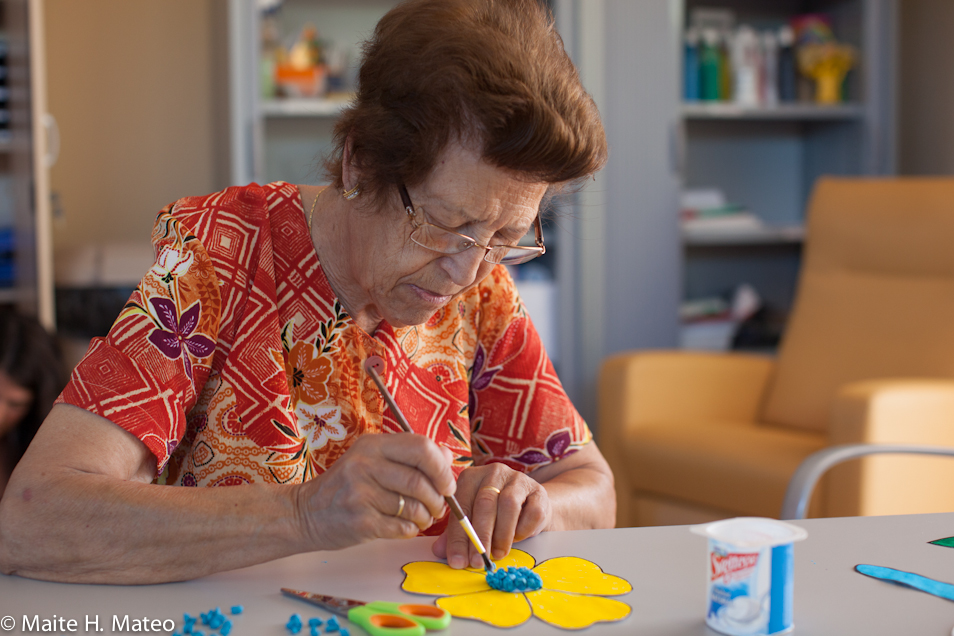 Etelvina es extremadamente perfeccionista en todo lo que hace. Lo mismo rellena flores para el mural de verano con bolitas de papel de colores, que arranca con esmero la maleza que crece entre las baldosas del patio. Pero haga lo que haga lo hace perfecto.
