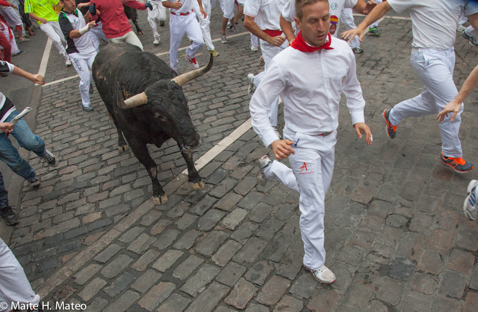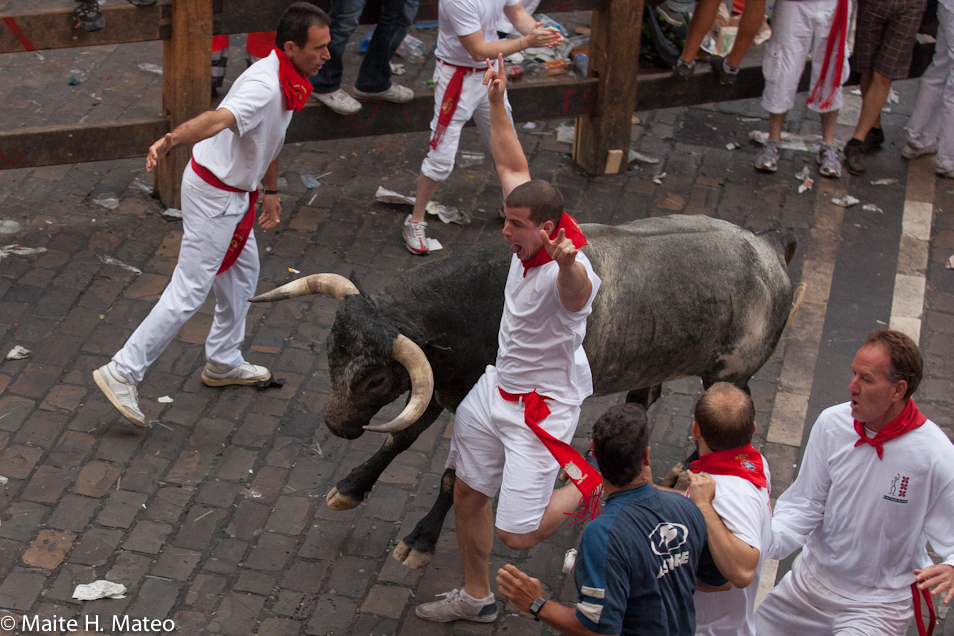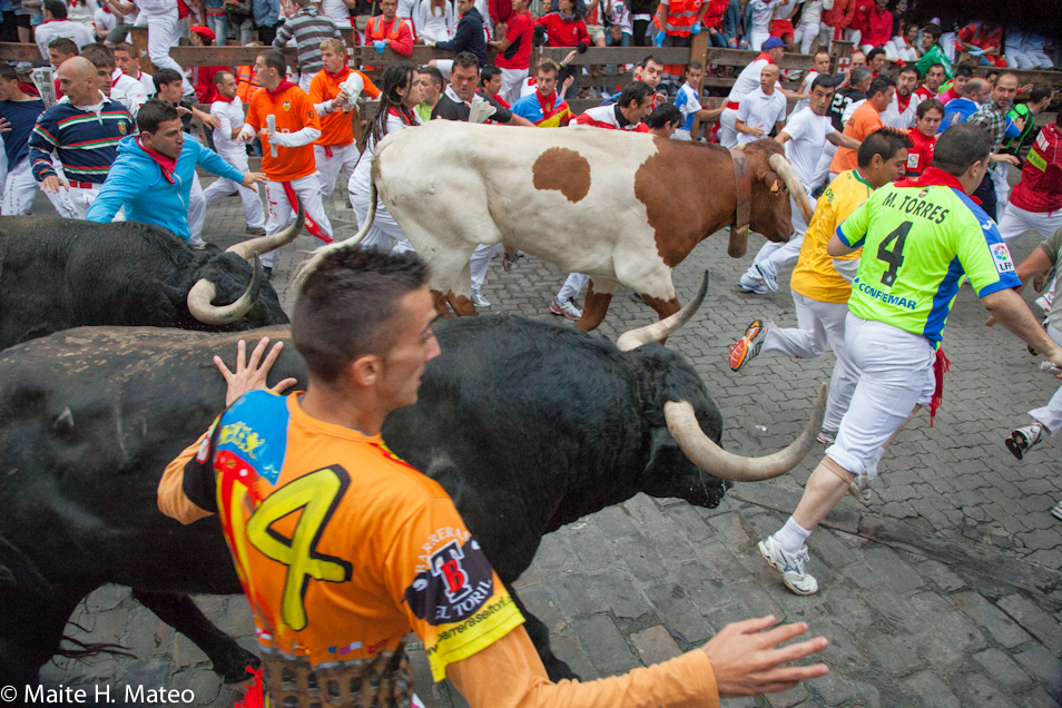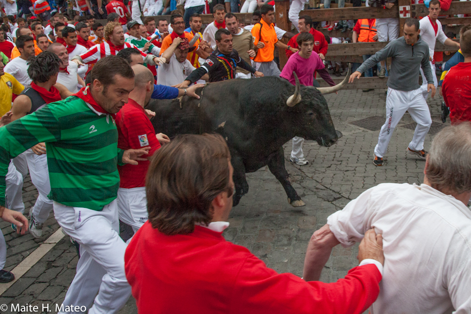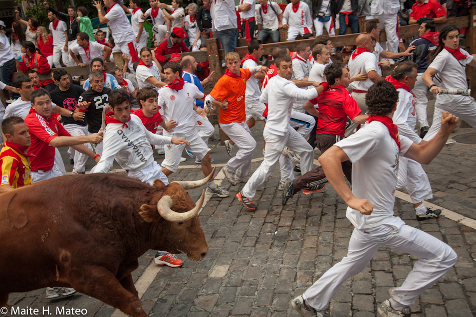 De pronto empiezan los gritos y todos corren. Aprieto la cámara. Con un ojo miro por el visor y con el otro busco los cuernos de los morlacos entre la masa de gente. Puedo oler el miedo de los mozos y escuchar las pezuñas de los toros chocando contra los adoquines. Y entonces lo veo. Viene adelantado, abriendo hueco entre la muchedumbre. Disparo sin piedad mientras mi corazón palpita a gran velocidad. Giro la cámara buscando a los demás: dos, tres cuatro, cinco… Y poco después, llega el sexto astado arropado por los cabestros.