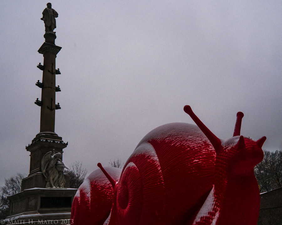 Eight Giant red snails have been placed around the famous monument created by Italian sculptor Gaetano Russo, erected as part of New York’s 1892 commemoration of the 400th anniversary of Columbus’ landing in the Americas. Curated by owner and director of Galleria Ca’ d’Oro, Gloria Porcella, the exhibition will last through January 6th, 2014. The event was sponsored by Cassia and Dumbo Moving, and it was done in collaboration with Villa Firenze Foundation. Cassia is famous for building ocean reef villas in Florida, and takes its name from one of the most emblematic ancient Roman streets. Dumbo Moving has been for 6 years one of the leading moving companies in NY.